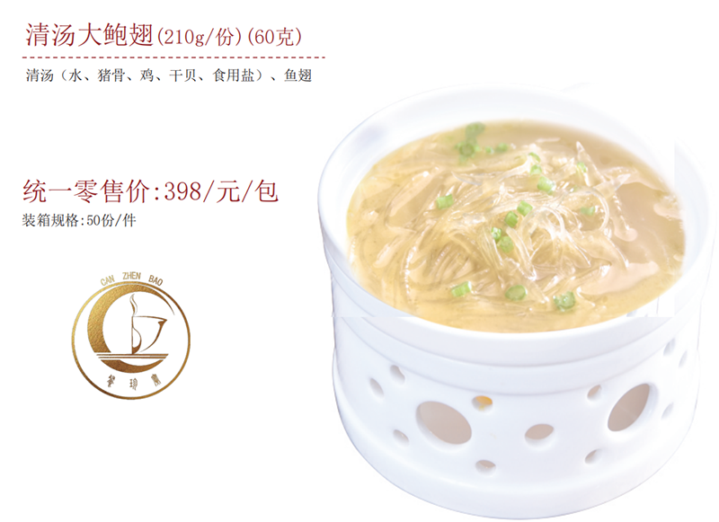 詳細(xì)信息 清湯大鮑翅(210g/份)(60克) 清湯(水、豬骨、雞、干貝、食用鹽)、魚翅 統(tǒng)一零售價:398/元/包 裝箱規(guī)格:50份/件 共0條 相關(guān)評論 |