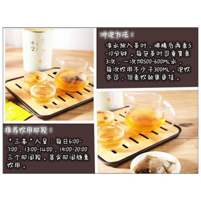 ②每包5g用500至600毫升水煮開后續(xù)煮5分鐘即可飲用,每小包茶葉可以重復(fù)煮三次,每次飲用不可少于300毫升。