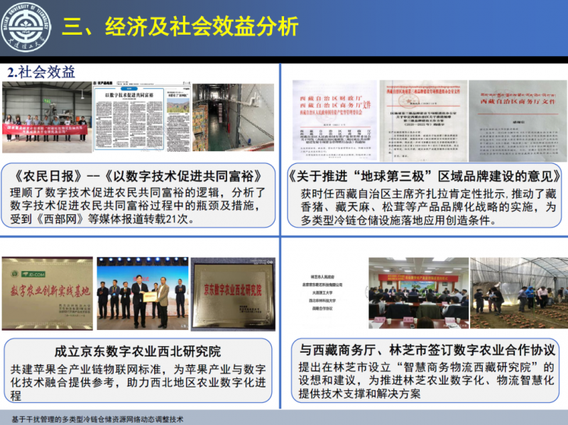 專家組經(jīng)評(píng)議認(rèn)為,成果針對(duì)生鮮農(nóng)產(chǎn)品多類型冷鏈倉儲(chǔ)資源網(wǎng)絡(luò)動(dòng)態(tài)調(diào)整難題,采用文獻(xiàn)研究、實(shí)地調(diào)研、運(yùn)籌優(yōu)化以及模擬仿真等方法,建立了平臺(tái)模式多目標(biāo)下冷鏈倉儲(chǔ)資源網(wǎng)絡(luò)動(dòng)態(tài)調(diào)整優(yōu)化框架,構(gòu)建了基于改進(jìn)Box splitting與自適應(yīng)大鄰域搜索的多目標(biāo)優(yōu)化高效求解方法,有利于解決冷鏈倉儲(chǔ)資源網(wǎng)絡(luò)受干擾下的動(dòng)態(tài)調(diào)整難題,富有創(chuàng)新性,具有重要的學(xué)術(shù)價(jià)值與應(yīng)用價(jià)值。成果研發(fā)的基于干擾管理的多類型冷鏈倉儲(chǔ)資源網(wǎng)絡(luò)動(dòng)態(tài)調(diào)整系統(tǒng),通過嵌入村鎮(zhèn)社區(qū)物流數(shù)據(jù)共享與集成平臺(tái),在陜西、黑龍江等多家涉農(nóng)企業(yè)開展了示范應(yīng)用,為解決村鎮(zhèn)農(nóng)產(chǎn)品多類型冷鏈倉儲(chǔ)資源網(wǎng)動(dòng)態(tài)調(diào)整難題提供了新方法和新技術(shù),經(jīng)濟(jì)和社會(huì)效益較顯著。成果面向我國村鎮(zhèn)多類型冷鏈倉儲(chǔ)資源網(wǎng)絡(luò)動(dòng)態(tài)調(diào)整實(shí)際需求,實(shí)現(xiàn)了多種冷鏈倉儲(chǔ)資源的高效配置與動(dòng)態(tài)調(diào)整,化解了有干擾、多目標(biāo)情形下冷鏈倉儲(chǔ)資源的動(dòng)態(tài)調(diào)整難題,有利于促進(jìn)我國多類型冷鏈倉儲(chǔ)資源社會(huì)化服務(wù)平臺(tái)模式的建立,對(duì)于提高村鎮(zhèn)冷鏈倉儲(chǔ)運(yùn)營管理水平和降低冷鏈倉儲(chǔ)基礎(chǔ)設(shè)施運(yùn)營成本具有較大的應(yīng)用價(jià)值和推廣前景。該成果總體達(dá)到國內(nèi)先進(jìn)水平。
