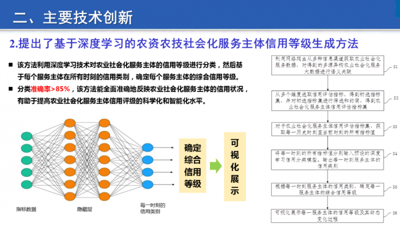 專家組經(jīng)評議認為,成果構(gòu)建了具有領(lǐng)域針對性的農(nóng)資農(nóng)技社會化服務(wù)主體信用評級指標體系,提出了基于深度學(xué)習(xí)和聯(lián)邦學(xué)習(xí)的農(nóng)資農(nóng)技社會化服務(wù)主體信用等級劃分方法,研發(fā)了農(nóng)資農(nóng)技社會化服務(wù)主體信用評級信息系統(tǒng),提高了農(nóng)資農(nóng)技社會化服務(wù)主體信用評級的自動化和智能化水平,技術(shù)集成水平和產(chǎn)品研發(fā)具有創(chuàng)新性。該成果具有評級結(jié)果客觀、操作簡便、更新頻率高、時效性強等特點,可在一定程度上彌補傳統(tǒng)信用評級工作中主觀性較強等不足,有助于提升我國農(nóng)資農(nóng)技社會化服務(wù)主體信用評級的智能化水平,能夠促進農(nóng)業(yè)社會化服務(wù)行業(yè)科技進步。該成果建立了農(nóng)資農(nóng)技社會化服務(wù)主體信用評價體系,可在一定程度上解決新型農(nóng)業(yè)經(jīng)營主體缺乏合格抵質(zhì)押物、金融機構(gòu)缺少信用信息、整個行業(yè)缺少評價體系等問題。該成果已在浙江農(nóng)資集團有限公司旗下的“呼呼打藥平臺”等產(chǎn)品中得到示范應(yīng)用,取得了良好的經(jīng)濟效益和社會效益。成果達到國內(nèi)領(lǐng)先水平,技術(shù)熟化程度高,具有廣闊的應(yīng)用前景。