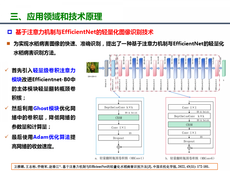 專家組經(jīng)評(píng)議認(rèn)為,成果為提高病蟲(chóng)害圖像診斷的準(zhǔn)確率,研究了基于卷積神經(jīng)網(wǎng)絡(luò)集成的農(nóng)作物病蟲(chóng)害智能診斷方法,提出了基于注意力機(jī)制與EfficientNet的輕量化圖像識(shí)別技術(shù)以及深度卷積神經(jīng)網(wǎng)絡(luò)動(dòng)態(tài)選擇集成技術(shù),為農(nóng)作物病蟲(chóng)害的精準(zhǔn)防控提供了技術(shù)保障,具有明顯技術(shù)自主創(chuàng)新。該成果的應(yīng)用與推廣,提高了農(nóng)作物病蟲(chóng)害識(shí)別的智能化程度,為農(nóng)作物病蟲(chóng)害的精準(zhǔn)防控提供了技術(shù)保障,具有一定的市場(chǎng)競(jìng)爭(zhēng)力。該成果操作簡(jiǎn)便、可靠性高,能夠?qū)崿F(xiàn)農(nóng)作物病蟲(chóng)害圖像的快速準(zhǔn)確識(shí)別。成果達(dá)到國(guó)內(nèi)外同類技術(shù)先進(jìn)水平,技術(shù)熟化程度高,具有較好的推廣應(yīng)用價(jià)值。