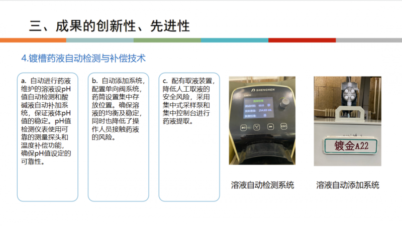 該成果突破了機(jī)械手靈活抓取和自動(dòng)尋跡技術(shù)、人與氰化物多重隔離安全防護(hù)技術(shù)、劇毒品鍍種集中管理技術(shù)、電鍍槽防揮發(fā)技術(shù)、矩陣式電鍍生產(chǎn)線以及鍍槽藥液自動(dòng)檢測(cè)與補(bǔ)償技術(shù)等關(guān)鍵技術(shù),實(shí)現(xiàn)了多品種小批量應(yīng)用,具有自動(dòng)化程度高、應(yīng)用轉(zhuǎn)化前景廣泛等優(yōu)點(diǎn),未來具有良好的技術(shù)成果轉(zhuǎn)化和推廣應(yīng)用前景。4.技術(shù)創(chuàng)新對(duì)推動(dòng)行業(yè)科技進(jìn)步和提高市場(chǎng)競(jìng)爭(zhēng)能力的作用 |