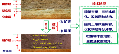 冬小麥秸稈還田“兩旋一深”增產(chǎn)增效技術(shù)的核心是:通過(guò)秸稈還田“兩旋一深”結(jié)合減氮這一簡(jiǎn)化輪耕模式,在維持產(chǎn)量潛力不降低的前提下降低整個(gè)生產(chǎn)系統(tǒng)的氮肥需求,實(shí)現(xiàn)系統(tǒng)固碳減排增產(chǎn)增效。對(duì)于土壤-大氣-小麥三個(gè)子系統(tǒng),一是改常年旋耕模式為“兩旋一深”,即每旋耕兩年深耕或深松一年,利用耕作技術(shù)環(huán)節(jié)加快秸稈腐解,改善土壤物理性狀、養(yǎng)分分布和有機(jī)質(zhì)含量,實(shí)現(xiàn)固碳減氮;二是在土體適當(dāng)深層擾動(dòng)前提下,建立小麥生產(chǎn)系統(tǒng)合理菌群結(jié)構(gòu),促進(jìn)養(yǎng)分循環(huán)轉(zhuǎn)化,降低土壤溫室氣體排放,實(shí)現(xiàn)減排;三是通過(guò)改善作物根系物理生存空間和養(yǎng)分空間分布來(lái)調(diào)優(yōu)小麥根系構(gòu)型,實(shí)現(xiàn)增產(chǎn)增效。