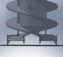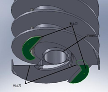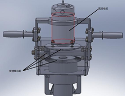 野外土壤原狀剖面土柱取土鉆,包括動(dòng)力裝置、原狀土內(nèi)筒、螺旋外筒、割土裝置;動(dòng)力裝置位于取土鉆頂部,與原狀土內(nèi)筒和螺旋外筒上下同心放置;動(dòng)力裝置變向齒輪箱下部固定軸上的原狀土內(nèi)筒固定套與原狀土內(nèi)筒聯(lián)接,原狀土內(nèi)筒置于螺旋外筒內(nèi)部,且向下穿過(guò)螺旋外筒內(nèi)壁下部的防塵軸承;螺旋外筒外壁焊有兩列平行片狀螺旋,兩列片狀螺旋底部焊有兩個(gè)螺旋剔土刀;螺旋外筒外壁相對(duì)位置各設(shè)一套割土裝置。