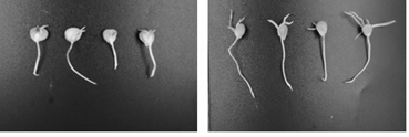 圖1鹽脅迫下GNC對玉米種子發(fā)芽狀況。左:CK;右:GNC處理。