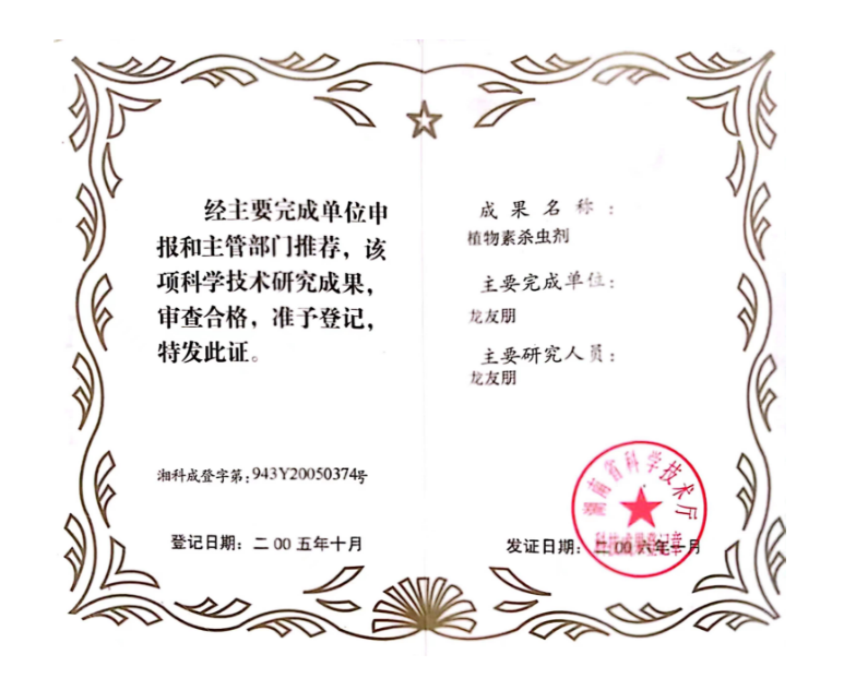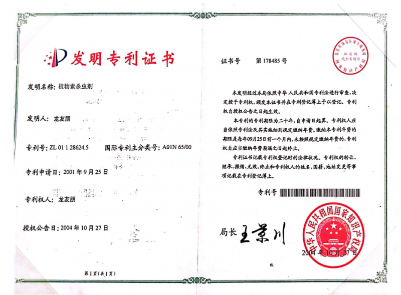 發(fā)明的主要原理是:(略)通過實(shí)驗(yàn)證明,它對菜青蟲、小菜蛾、菜螟、蚜蟲、斜紋夜蛾、茶葉毛蟲、菜蟻、稻飛虱、稻卷螟、鉆心蟲等病蟲害有較好的殺蟲和防治效果。