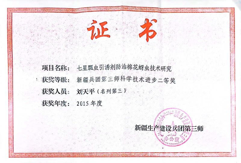 本專利發(fā)明項目研究獲得2015年度新疆生產(chǎn)建設(shè)兵團第三師科學(xué)技術(shù)進步二等獎。
