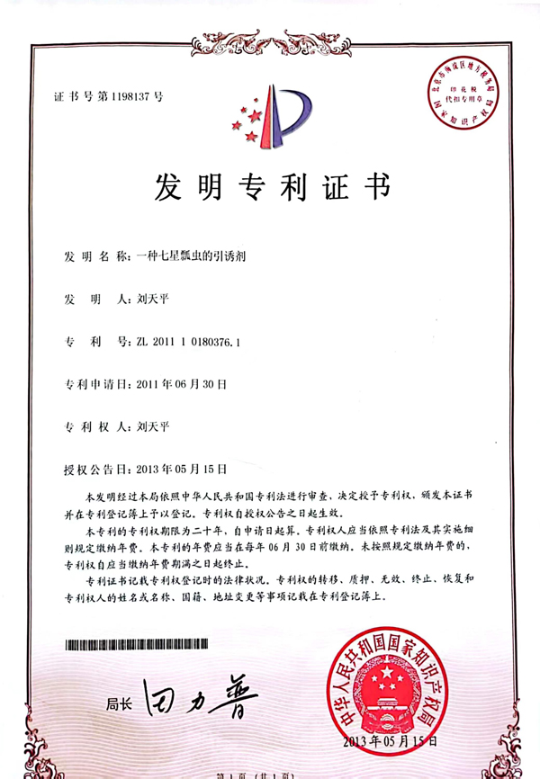 [0007]所述的引誘劑,該劑對瓜果,蔬菜和紅棗、核桃、香梨、蘋果樹實施噴施,同樣產(chǎn)生引誘七星瓢蟲滅殺蚜蟲的技術(shù)效果。