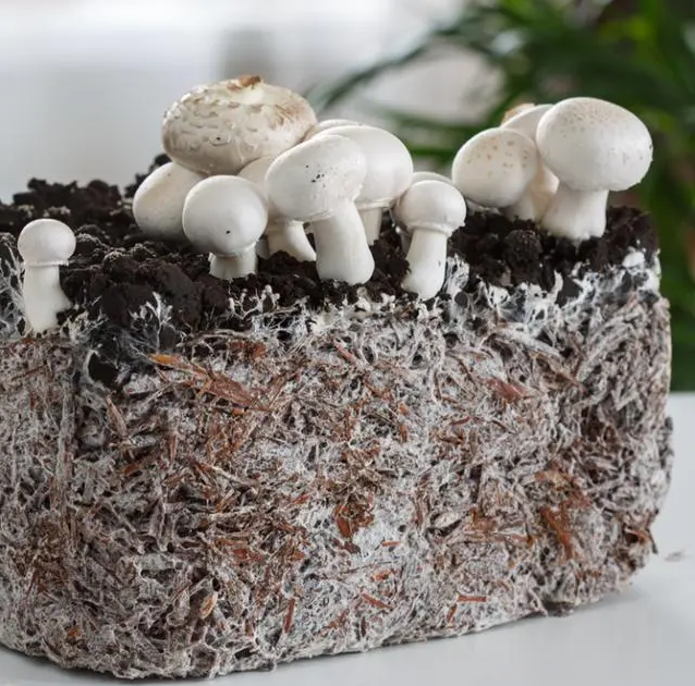 在一塊培養(yǎng)基質(zhì)上生長(zhǎng)的雙孢蘑菇,褐色基質(zhì)表面白霜狀的就是菌絲體|圖源:out-grow.com