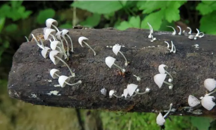 與之類(lèi)似的還有長(zhǎng)在樹(shù)干、枯木上的白小鬼傘,也是非常細(xì)小纖弱的種類(lèi)。