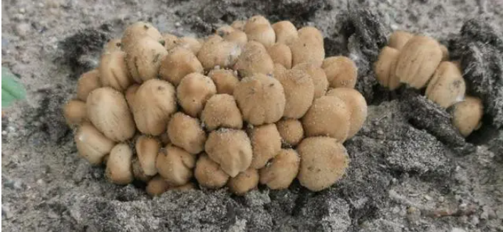 雨后的樹(shù)下常會(huì)長(zhǎng)出一些褐色的蘑菇,鐘形的傘蓋,成簇生長(zhǎng)。這是晶粒小鬼傘,看上去臟兮兮的,而且存在時(shí)間很短,雖然通常沒(méi)有明顯的毒性,但一般沒(méi)人會(huì)吃。