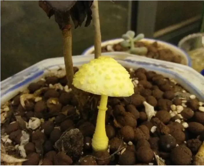 花盆里的純黃白鬼傘,對(duì)盆里的植物無(wú)害|圖源:agricoop.cn