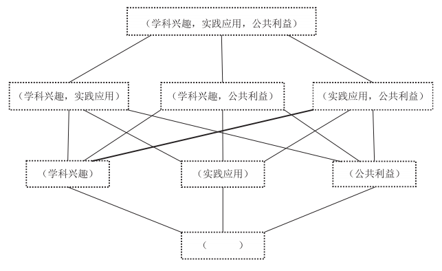 不同階段的知識(shí)生產(chǎn)核心目標(biāo)隨著社會(huì)發(fā)展需求的進(jìn)步而迭新,正如知識(shí)生產(chǎn)模式3在模式1和模式2邏輯基礎(chǔ)上演繹而來(lái),新農(nóng)科改革并不意味著拋棄傳統(tǒng)農(nóng)科發(fā)展目標(biāo),而是對(duì)前者知識(shí)生產(chǎn)目標(biāo)的豐富與延伸,從而在目標(biāo)更深基礎(chǔ)上帶動(dòng)學(xué)科布局的調(diào)整優(yōu)化,在此引入概念格(Galois格)理論厘清新農(nóng)科之于傳統(tǒng)農(nóng)科學(xué)科知識(shí)生產(chǎn)的新生目標(biāo)內(nèi)涵。概念格理論作為形式概念分析的數(shù)據(jù)結(jié)構(gòu),通過(guò)明晰概念間的層次結(jié)構(gòu)[8],可視化展現(xiàn)農(nóng)科學(xué)科不同發(fā)展階段復(fù)雜的目標(biāo)內(nèi)涵及其層級(jí)體系,形象地表征農(nóng)科學(xué)科目標(biāo)內(nèi)涵的演進(jìn)。在3種知識(shí)生產(chǎn)模式視角下,傳統(tǒng)農(nóng)科-新農(nóng)科知識(shí)生產(chǎn)目標(biāo)重力變化演繹為學(xué)科興趣-實(shí)踐應(yīng)用-社會(huì)公共利益。將學(xué)科興趣(A1)、實(shí)踐應(yīng)用(A2)、社會(huì)公共利益(A3)3個(gè)不同階段的農(nóng)科學(xué)科知識(shí)生產(chǎn)目標(biāo)重心視為3個(gè)同等重要的概念目標(biāo)并進(jìn)行組合,記為A={(A1),(A2),(A3)};接著兩兩組合形成新的3個(gè)同等重要的目標(biāo)概念,記為B={(A1,A2),(A1,A3)),(A2,A3)};3個(gè)目標(biāo)組合形成一個(gè)新的概念,記為C={(A1,A2,A3)}。從層次來(lái)看A中的概念內(nèi)核小于B,B中的概念內(nèi)核小于C,即(A1)=(A2)=(A3)≤(A1,A2)=(A1,A3)=(A2,A3)≤(A1,A2,A3)。如下用HASSE圖來(lái)表達(dá)各目標(biāo)概念之間的關(guān)系。