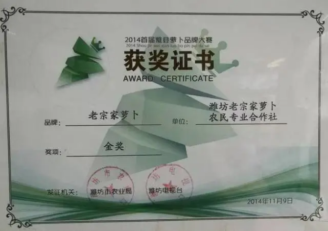 品牌起步:1999年11月,寒亭區(qū)率先注冊(cè)了“濰縣牌”蘿卜商標(biāo),之后又連續(xù)開(kāi)發(fā)了多種禮盒包裝,單個(gè)蘿卜價(jià)格由5角到1.5元,再到5元左右,濰縣蘿卜從此進(jìn)入了精品包裝銷(xiāo)售階段;2000年,“濰縣蘿卜”獲中國(guó)國(guó)際農(nóng)業(yè)博覽會(huì)名牌產(chǎn)品稱(chēng)號(hào),品牌認(rèn)可度初步形成。