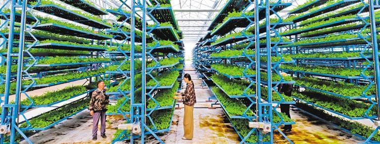 9月16日,甘肅省張掖市臨澤縣三二村綠色低碳現(xiàn)代循環(huán)農(nóng)業(yè)產(chǎn)業(yè)園內(nèi),工作人員在溫室立體式育苗中心查看種苗長勢。王將 攝(中經(jīng)視覺)
