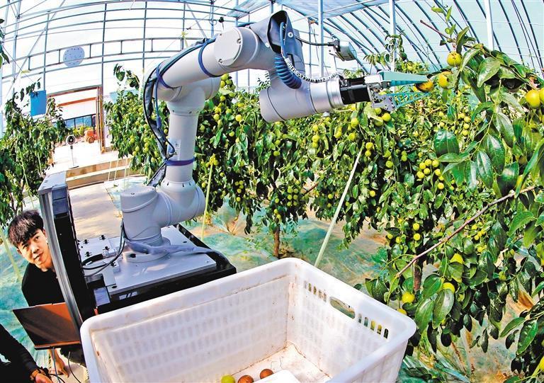 7月4日,陜西省渭南市大荔縣,冬棗采摘機(jī)器人在綠豐源冬棗種植農(nóng)場投入使用。該機(jī)器人可自主辨別成熟冬棗,并避開枝葉實(shí)現(xiàn)無損采摘。李世居 攝(中經(jīng)視覺)