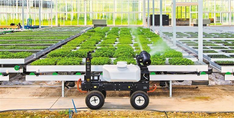 7月31日,浙江省金華市長山鄉(xiāng),農(nóng)業(yè)無人植保車在雙龍實(shí)驗(yàn)室蔬菜農(nóng)藝農(nóng)機(jī)融合示范試驗(yàn)基地玻璃溫室內(nèi),進(jìn)行噴藥作業(yè)。胡肖飛 攝(中經(jīng)視覺)