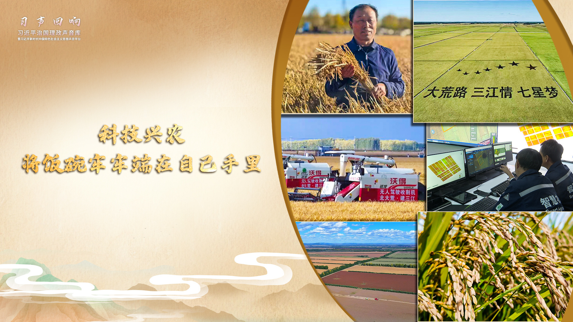 2018年9月25日,正在黑龍江省考察的習(xí)近平總書記來(lái)到七星農(nóng)場(chǎng)北大荒精準(zhǔn)農(nóng)業(yè)農(nóng)機(jī)中心。他走進(jìn)稻田,拿起一把稻穗,看谷粒、觀成色??倳浿赋?,中國(guó)人要把飯碗端在自己手里,而且要裝自己的糧食。他囑托北大荒人,農(nóng)業(yè)要振興,就要插上科技的翅膀。