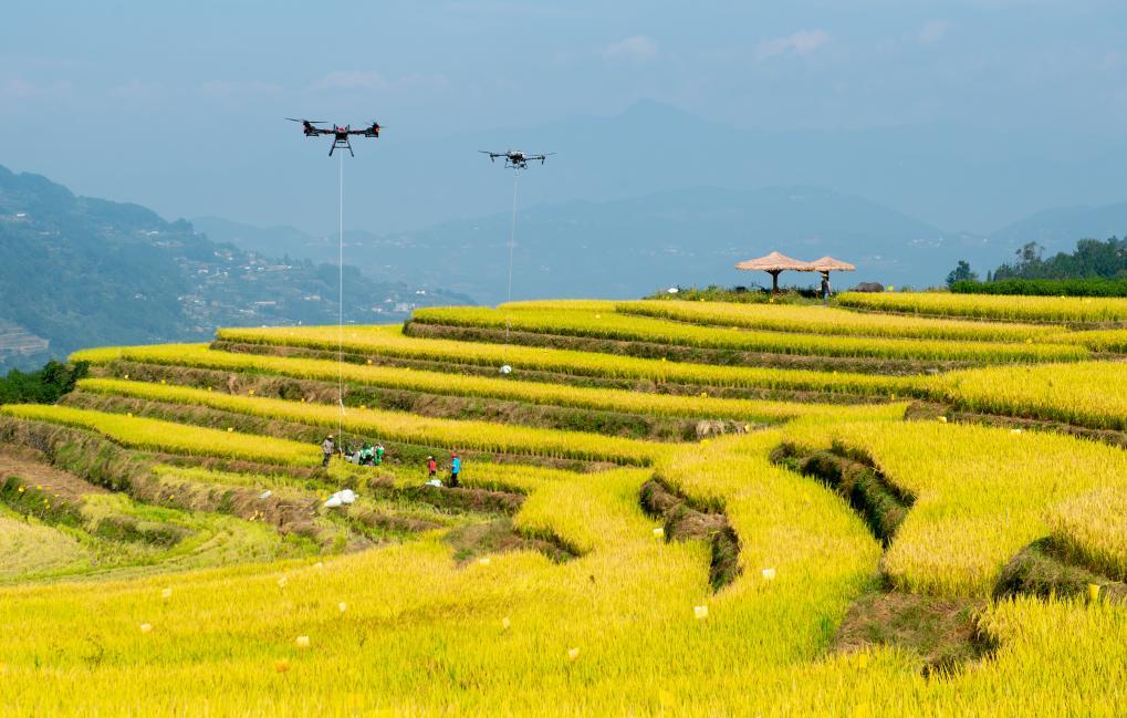 10月10日,湖北省秭歸縣沙鎮(zhèn)溪鎮(zhèn)長春村村民用無人機(jī)轉(zhuǎn)運(yùn)收獲的水稻(無人機(jī)照片)。新華社發(fā)(雷勇 攝)