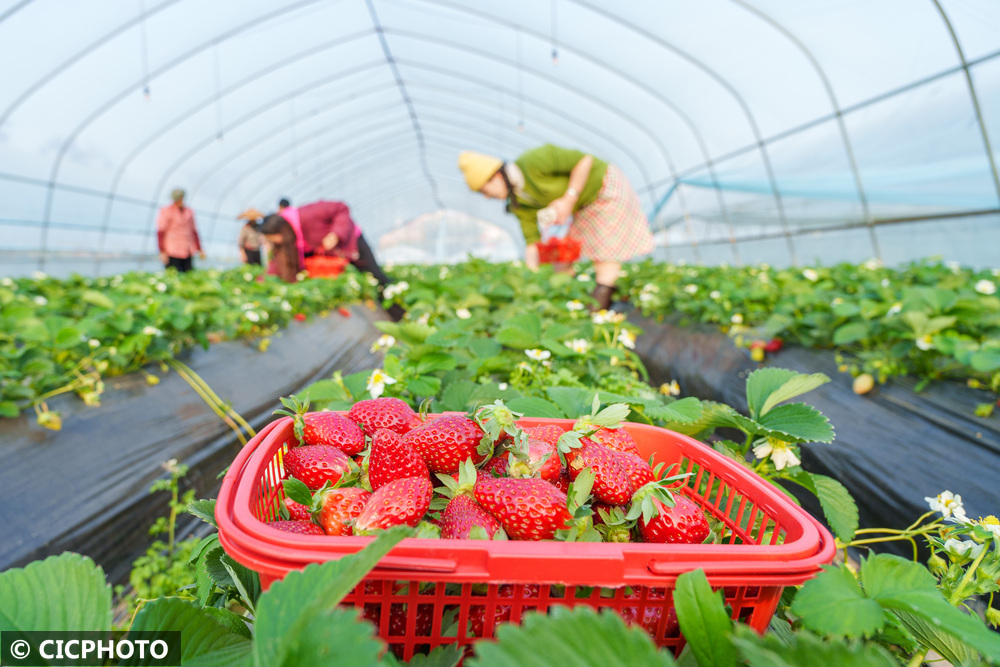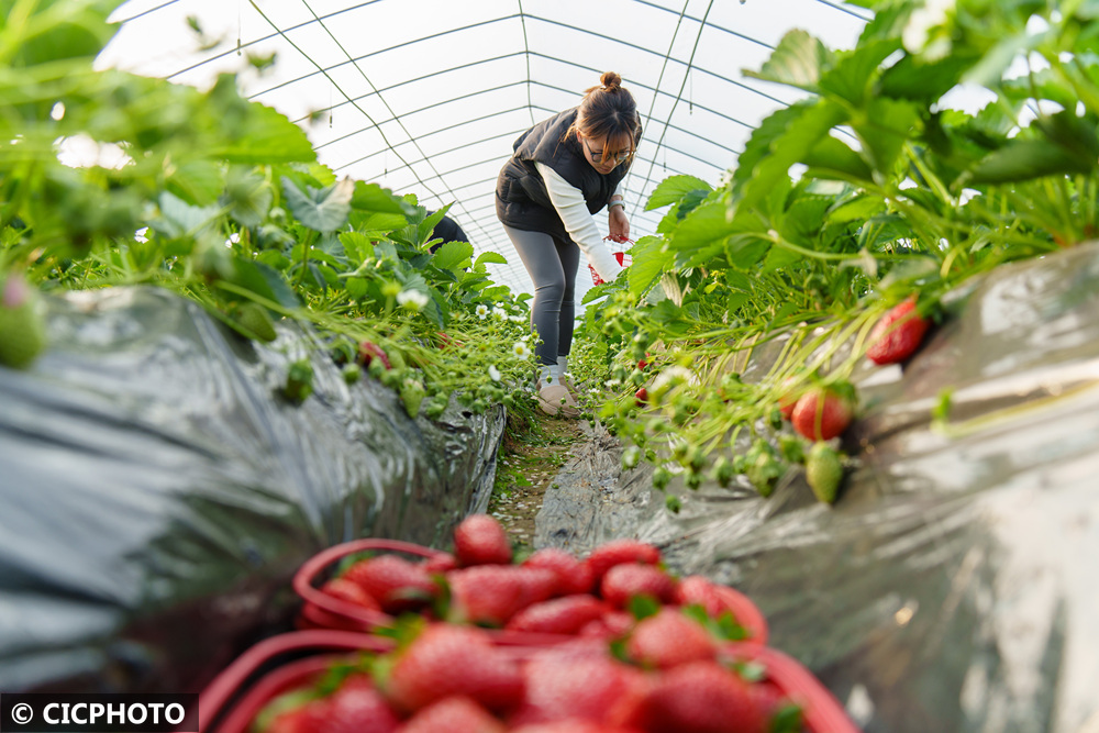 農(nóng)民在湖南省永州市冷水灘區(qū)珊瑚街道一草莓園大棚內(nèi)采摘草莓。CICPHOTO/雷中祥 攝