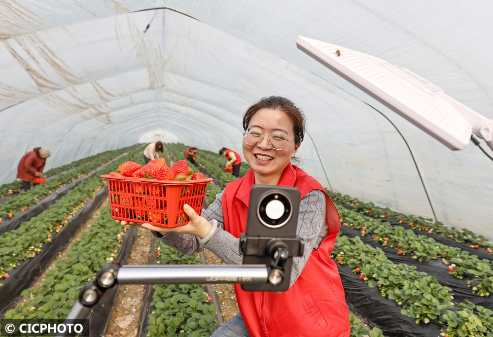在江蘇省宿遷市泗洪縣歸仁鎮(zhèn)江橋社區(qū)草莓種植基地草莓大棚,志愿者幫助果農(nóng)直播銷售草莓。CICPHOTO/張連華 攝
