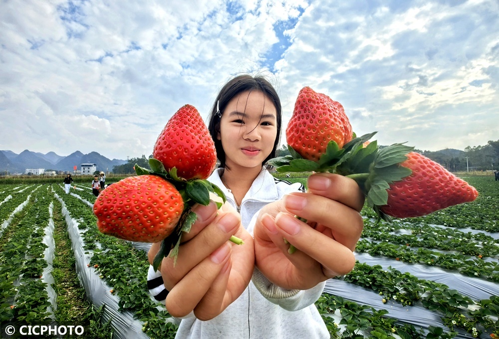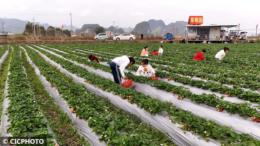 冬日時節(jié),多地種植的草莓陸續(xù)成熟。圖為游客在廣西來賓市忻城縣古蓬鎮(zhèn)龍利村草莓園采摘草莓。CICPHOTO/樊紹光 攝