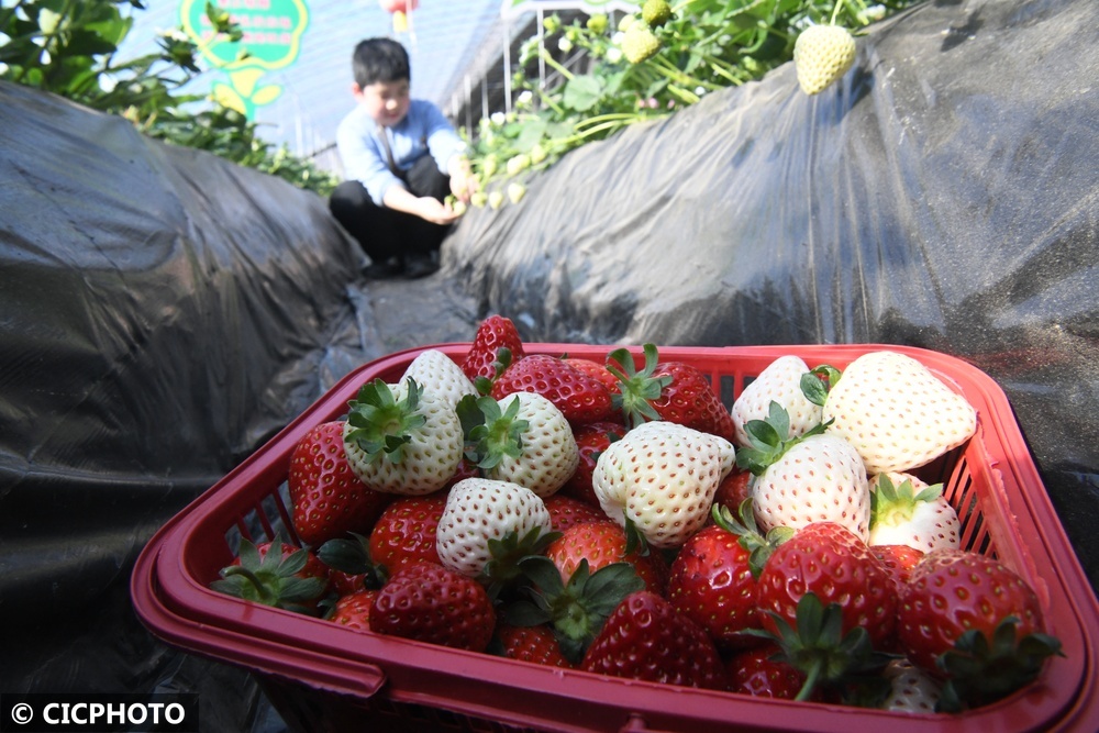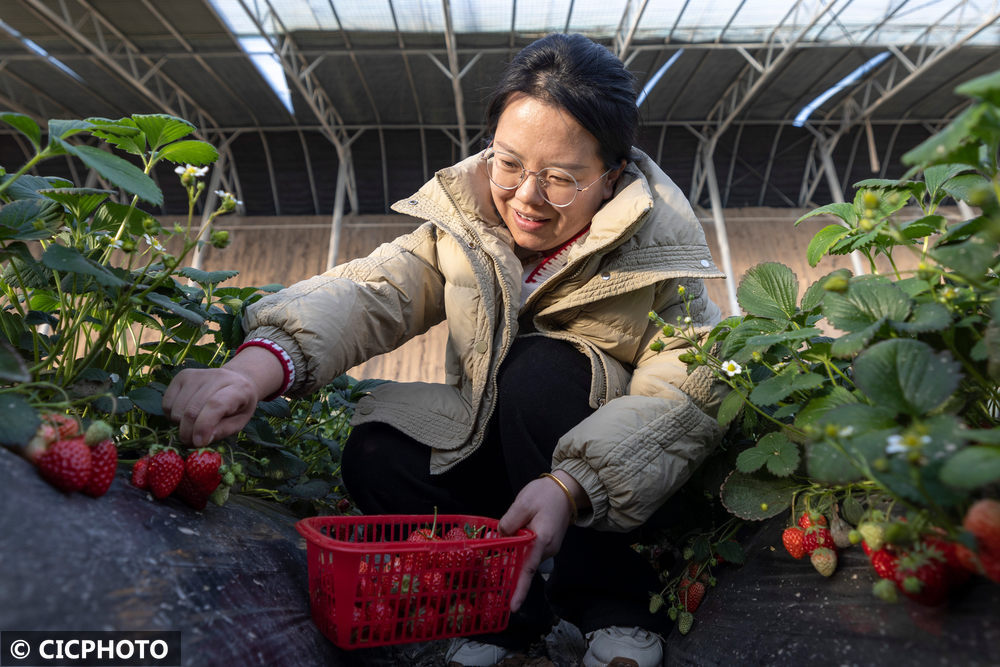 游客在江蘇省連云港市東??h石榴街道姜莊村草莓大棚內(nèi)采摘草莓。CICPHOTO/李嬌 攝