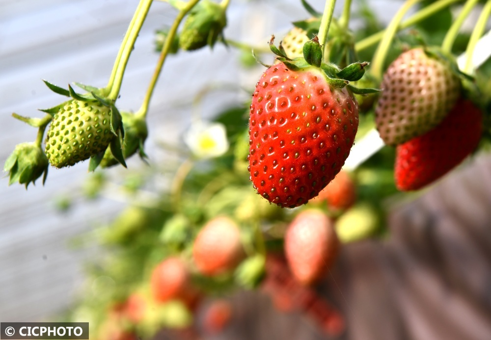 在河北省石家莊市欒城區(qū)一草莓種植基地拍攝的草莓。CICPHOTO/李明發(fā) 攝