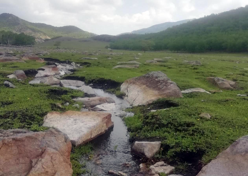 沿著幽谷中曲曲彎彎的小路慢慢前行,仿佛行進(jìn)在歷史久遠(yuǎn)的山水畫廊中。途中,不僅可以盡享夏日赤足涉水之樂,更可觀賞秀麗的山澗風(fēng)光。在這片彰顯無限魅力的草原上,可見彎彎曲曲的小河,炊煙裊裊的村落,山谷溝壑間條條小溪,流水潺潺,清澈見底,雖無江河之涌流,卻有塞外邊陲山水之妙趣,為整座黑羊山增添了神韻和美感,構(gòu)成了一幅幅美麗的圖畫。河流兩岸,還有不知經(jīng)過多少年,在溪水的沖刷下,把堅硬的石頭磨削成光滑的石槽或石板,從而形成了一片令人稱奇的石海。此時此景,不禁使人想起古代哲人對水的評價——水為至柔之物,卻能克剛。