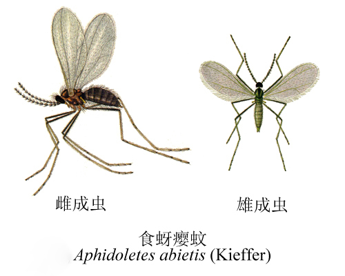 食蚜癭蚊屬雙翅目,癭蚊科,是蚜蟲的常見捕食性天敵,可以捕食60余種蚜蟲。食蚜癭蚊的成蟲、幼蟲均善于捕食,每頭食蚜癭蚊幼蟲平均可殺死 40~50頭蚜蟲,防效可達 90%。食蚜瘦蚊分布廣泛,遍及全北區(qū)。