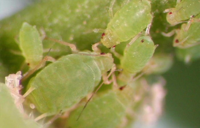 蚜蟲喜食嫩葉及生長點,一般以成蚜群集在葉背吸食汁液,分泌蜜露,使葉片萎縮、變黃,并傳播病毒害,是影響作物產(chǎn)量的主要害蟲之一,也是地球上最具破壞性的害蟲之一。