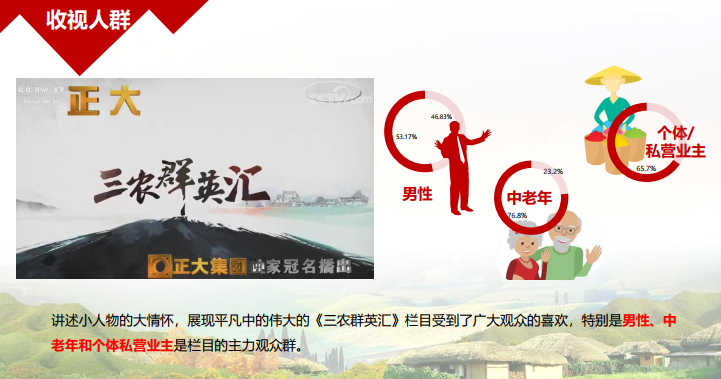 節(jié)目內(nèi)容勵志,調(diào)性上揚(yáng),緊抓主流題材,講好“三農(nóng)”故事,樹立良好的奮斗夢典范,成功勵志的過程中弘揚(yáng)社會正能量。