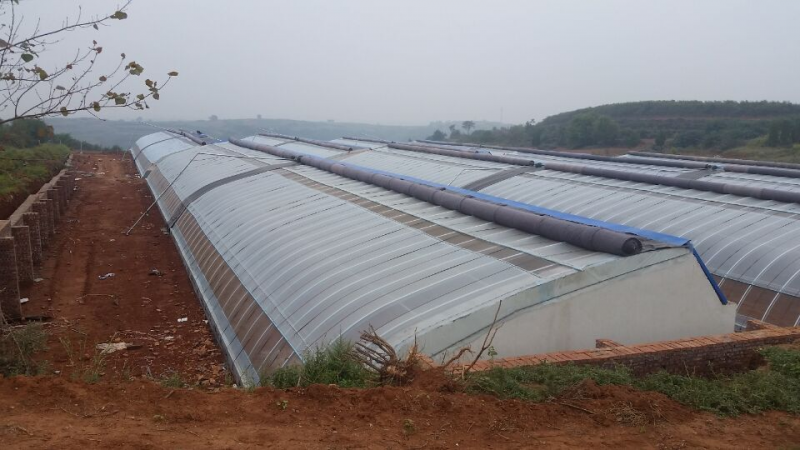1.1日光溫室 日光溫室東西走向,北、東、西三面墻均為磚墻或加厚土墻,墻體內(nèi)可設(shè)夾心保溫層;南向為受光面,用塑料薄膜覆蓋,陽光充足,上覆保溫草簾或保溫被,保溫效果好。傳統(tǒng)日光溫室無輔助加溫設(shè)備。改良式日光溫室配備有熱風(fēng)加熱或暖氣(水暖)加熱,或是在土層下鋪設(shè)送熱管道,給土壤加溫。 日光溫室的透光性能好,保溫與增溫性能優(yōu)良,造價適中,適合葡萄提前或延后栽培。有輔助加熱的改良式日光溫室可以從事葡萄周年生產(chǎn)。日光溫室單棟面積適中,一般長度50米,跨度6~12米。