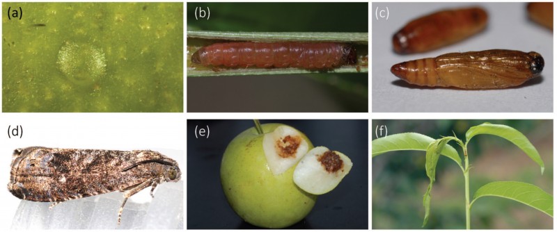 梨小食心蟲各蟲態(tài)。a:卵;b:幼蟲;c:蛹;d:成蟲;e、f:為害狀。(參考資料2)