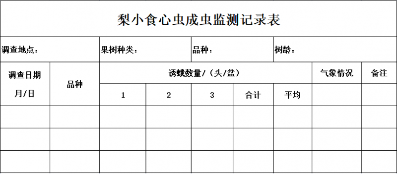每天定時(shí)檢查誘捕器中的成蟲數(shù)量,結(jié)果記入表內(nèi)(可參考上方表格)。檢查完畢后剔除成蟲,并補(bǔ)充水分,雨后須加少量洗衣粉。誘芯每30天更換一次。
